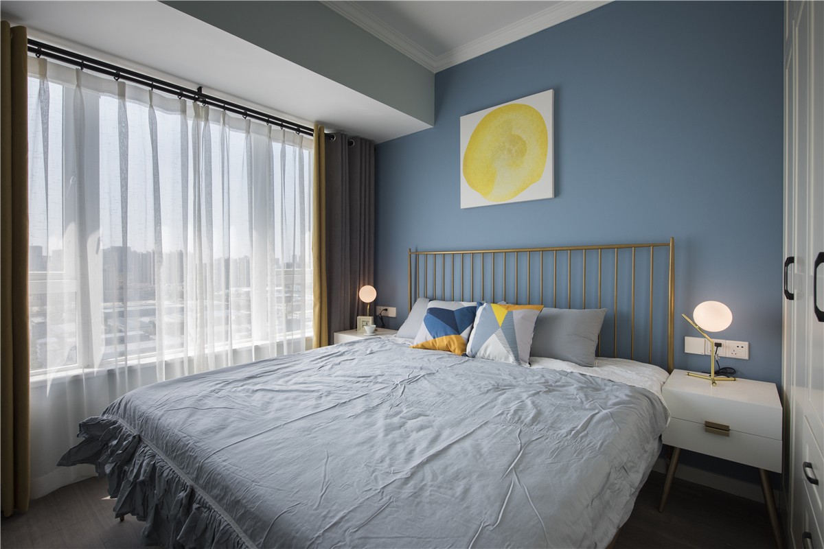 室內主臥裝修案例,通過拆除主臥空間原有的飄窗來擴大主臥空間,滿足兩個床頭柜的需求。