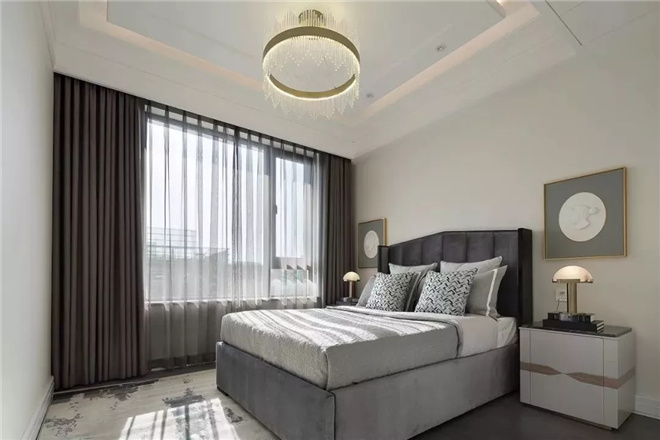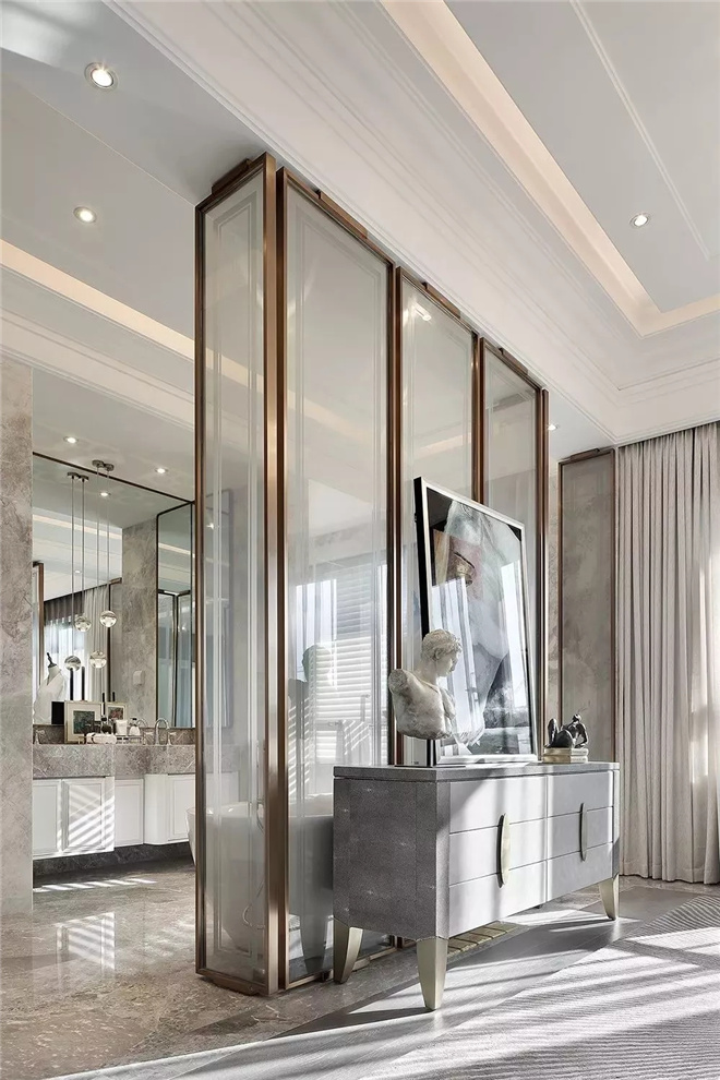 主臥室摒棄復雜陳設,用簡約手法詮釋了一個舒適的空間環境。臥室內沉穩睿智的咖色家具與質感極強的床飾,于細節處鍛造低調奢雅;藝術感十足的斷臂雕塑增添了空間的文藝氣息