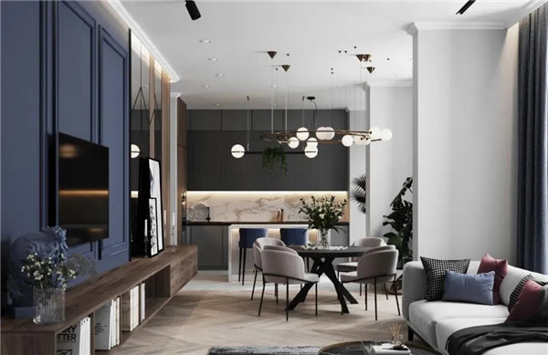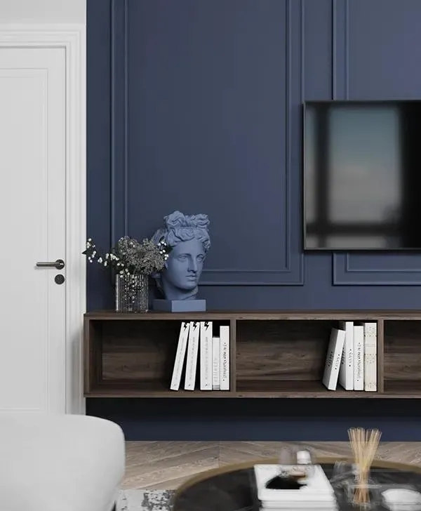 白色背景墻與電視墻藍色調相結合,形成一種清新明亮的視覺效果,搭配一些原木色家具,營造出一個簡約而有型的輕文藝之家。